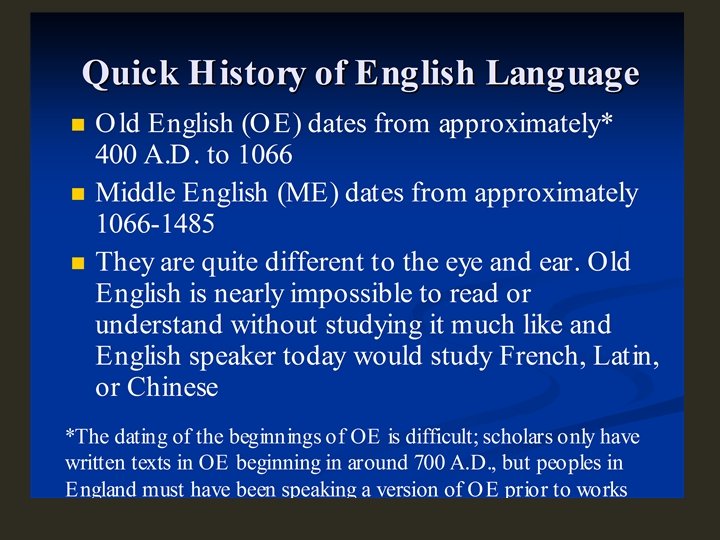 NORMAN INVASION (1066): BEGIN MEDIEVAL ERA Battle of Hastings - the Normans (powerful Norman Frenchmen) defeated the English and started a conquest of England Two most important effects: French becomes official language of politics and power; thus, enormous influence on Old English England begins unifying under a French political system, much of which is still with us today