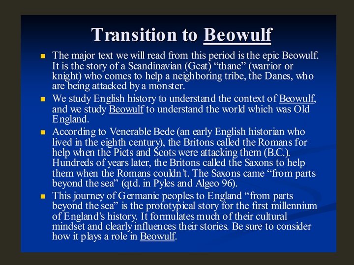 INTRODUCTION Beowulf was written in the Anglo-Saxon era. Around the year 525. Literature was transmitted orally instead of in writing. Runic alphabet did exist - only used for inscriptions. Beowulf was result of storytelling
