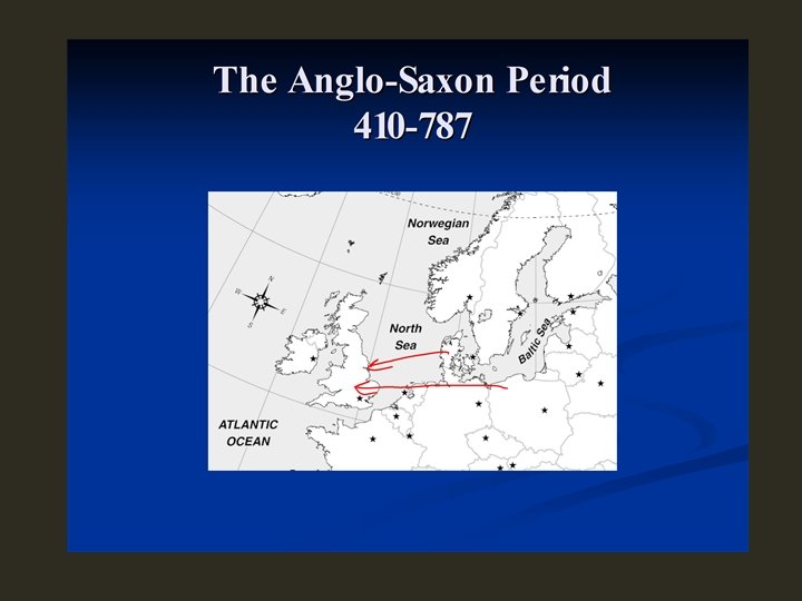 IMPORTANT EVENTS IN THE FIRST ANGLO -SAXON PERIOD 410 -450 - Angles and Saxons invade from Baltic shores of Germany Nine Anglo-Saxon kingdoms eventually became the Anglo. Saxon heptarchy