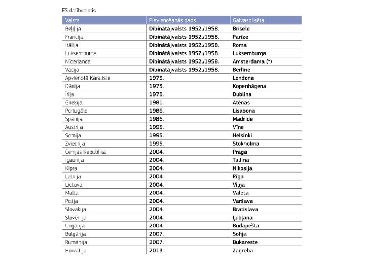 Ieguvumi no dalības Eiropas Savienībā • Atvieglota tirdzniecība ar citām ES dalībvalstīm • Valsts ekonomiskā izaugsme (lielākas investīcijas, ražošanas attīstība, eksporta pieaugums u. c. ) • Labāks, uzticamāks Latvijas tēls ārvalstīs • Iespēja izmantot ES fondu līdzekļus valsts attīstībā • Valstij vieglāk pārvarēt ekonomiskās krīzes, lielāka iespēja saņemt palīdzību nepieciešamības gadījumā (piemēram, liela mēroga ekonomiskās krīzes gadījumā, kādu Latvija piedzīvoja 2009. gadā) • Lielāka valsts ekonomiskā stabilitāte • Iespēja brīvi mācīties un strādāt citās ES dalībvalstīs • Brīva preču kustība ES • Drošības sajūta ārpolitikas jautājumos • Iespēja piedalīties ES lēmumu pieņemšanā un ietekmēt tos