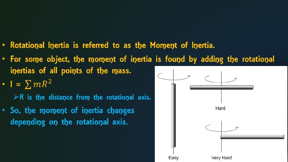 • Rotating objects have a tendency to continue rotating. Non-rotating objects have a tendency to not rotate. ØRotational Inertia describes these tendencies. • Linear Inertia is simply the object’s total mass. • Rotational Inertia depends on the distribution of an object’s mass as well.