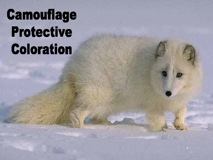 Camouflage Protective Coloration Camouflage in which colors and patterns of organisms match the surrounds. This helps animals hide from predators.