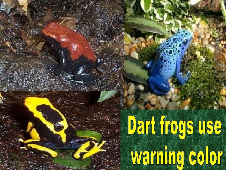 Protective Coloration Many animals only line of defense is their colors. The warning colors of red, yellow, orange, and bright blue warn others that these animals might be dangerous and should be avoided! These dart frogs are poisonous.
