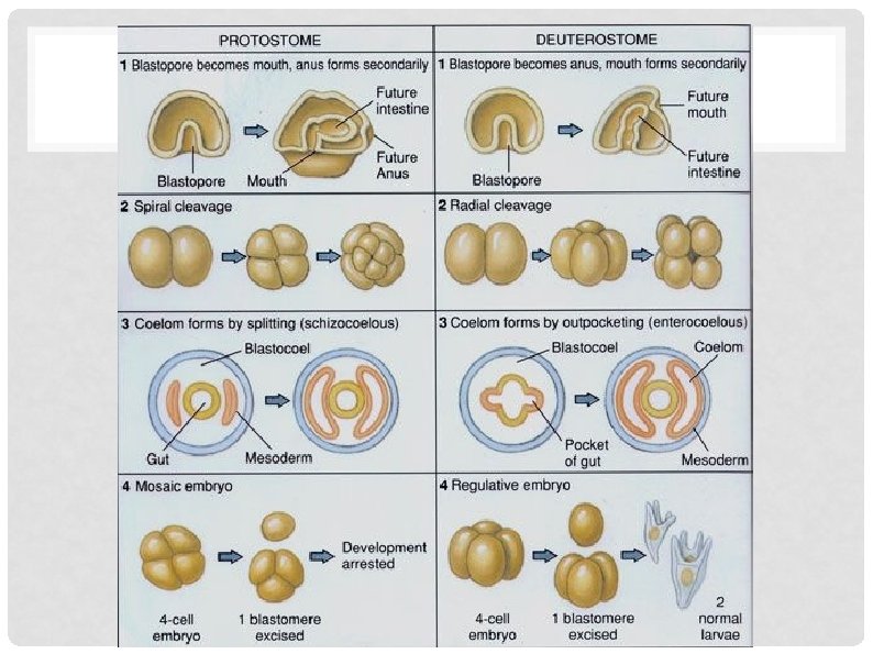 ANIMAL DEVELOPMENT Another main difference in the way animals develop is the development of the blastopore, or the opening that forms the mouth or anus. In protostomes, which means “mouth first”, the blastopore develops into the mouth. (found in annelids, mulluscs, and arthropods). In deuterostomes, which means “mouth second”, the blastopore develops into the anus. (found in echinoderms and chordates).