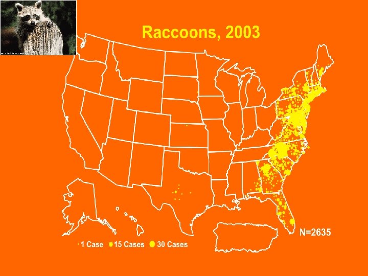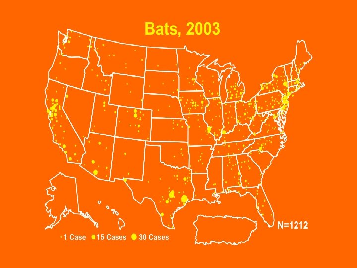 Human Rabies Data US acquired cases only TX 1990 1 case Bat related 1991 2 cases AK, GA Bat related 1993 2 cases NY, TX Bat related 1994 4 cases CA, AL Bat related 1995 4 cases CA(2), CT, WA Bat related 1996 2 cases MT, KY Bat related 1997 4 cases MT, WA, NY, TX Bat related 1998 1 case VA Bat related 2000 5 cases CA, NY, GA, MN, WI Bat related 2002 3 cases CA, TN, IW Bat Related 2003 1 case VA Raccoon Related 2004 2 cases CA, WI Bat related