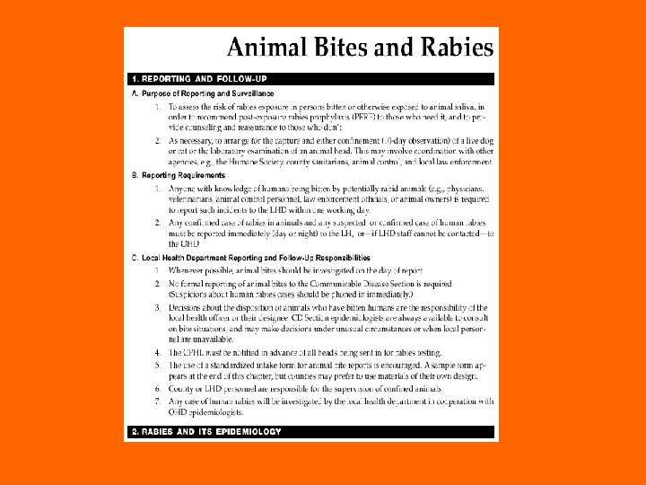 Animal Bites & Rabies Oregon Administrative Rules • Vaccination of an animal against rabies is valid only when performed: a) by a licensed veterinarian; b) by a veterinary technician (certified according to OAR 875 -030 -0010) under the supervision of a licensed veterinarian; or • Except as provided in (3), any dog, cat, or ferret that has bitten a person shall be held for observation until the tenth day following the bite. This observation shall be under the supervision of a Licensed Veterinarian or other person designated by the Local Public Health Authority.