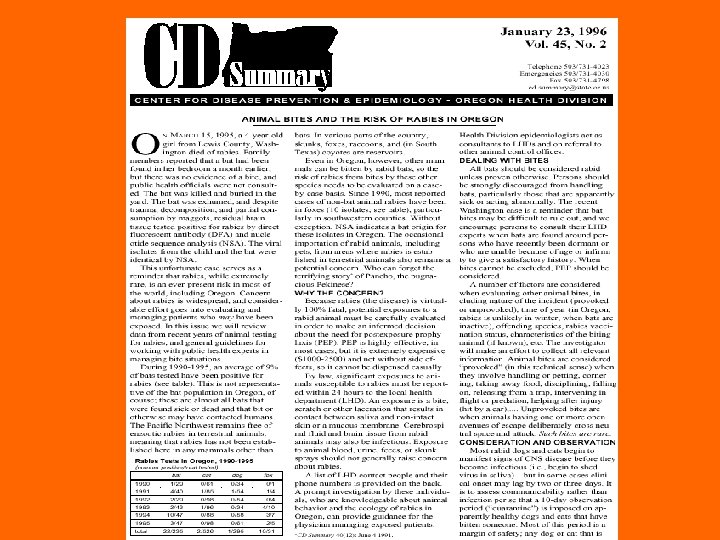 Year Bat Cat Dog Fox Other Animals 1990 1/29 0/61 0/34 0/14 1991 4/40 1/85 1/54 1/4 0/19 1992 2/29 0/98 0/54 1993 2/43 1/96 0/34 4/10 0/59 1994 10/47 0/88 0/58 3/7 0/78 1995 3/47 0/98 0/61 5/5 0/159 1996 3/48 0/51 0/33 0/58 1997 14/116 1/83 0/52 0/6 0/45 1998 6/95 0/56 0/3 0/49 1999 11/115 1/95 0/45 0/1 1/47 (Cow) 2000 8/73 0/79 0/56 1/4 0/4 2001 4/59 0/67 0/46 0/1 0/41 2002 12/134 0/102 0/27 2/4 0/29 2003 6/61 0/75 0/36 1/5 0/39 2004 7/88 0/105 0/42 0/27 2005 8/83 0/100 0/48 0/1 0/23 2006 23/126 0/72 0/26 2/4 0/41 2007 12/153 0/80 0/33 0/1 0/26 Totals 1990 -2007 136/1386 9. 8% 4/1530 0. 26% 1/798 0. 12% 19/68 28% 1/812 0. 1%