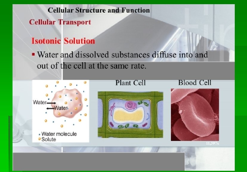 Cellular Structure and Function Cellular Transport Hypotonic Solution § Solute concentration is higher inside the cell. § Water diffuses into the cell. Plant Cell Blood Cell 13, 000 x