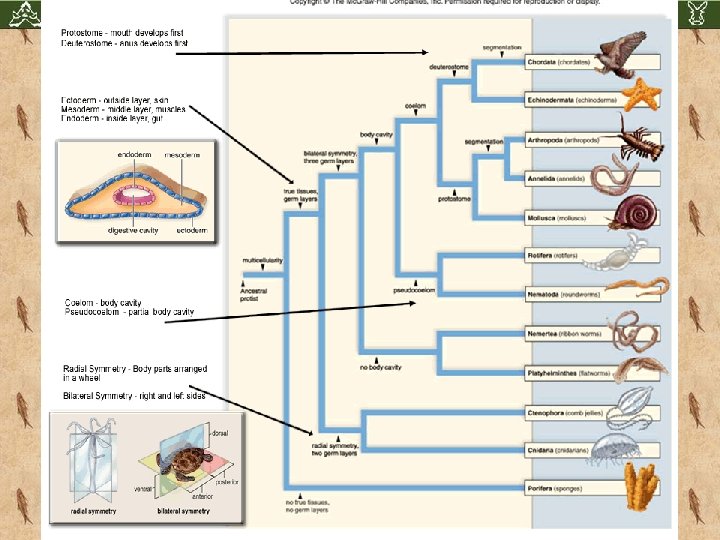 Cephalization • Bilateral symmetry is associated with cephalization, differentiation of a head. – Nervous tissue, sense organs, and often the mouth are located in the head. – Advantages for organisms moving head first – directional movement. – Elongation along anteroposterior axis.