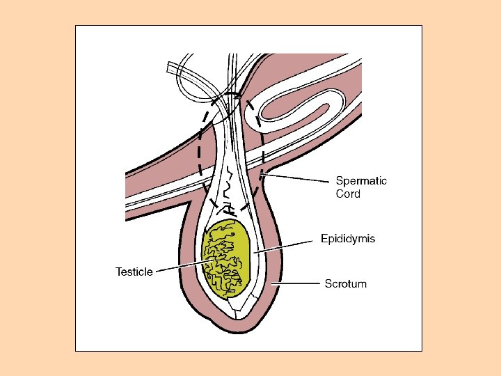 The spermatic cord extends from the body through the inguinal ring to suspend the testes within the scrotum. The cremaster muscle, spermatic cord, and tunica dartos muscle raise and lower the testes to maintain a constant temperature (4 – 6 degrees below body temperature) for sperm to develop.