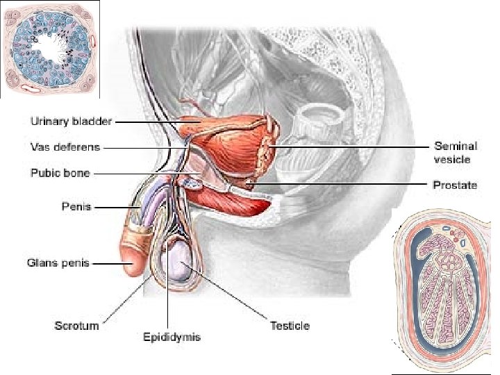 The Human Male Reproductive System • Testis (sl)/ Testes (pl)- olive size (1 -1. 5 in) – Divided into lobules. Male Gonads • Lobules contain 1 -4 seminiferous tubules – Between seminiferous tubules are interstitial cells (Leydig cells) • Interstitial cells produce androgens = testosterone – Sperm leave S. F. T. to go into epididymus. (mobilizes sperm)