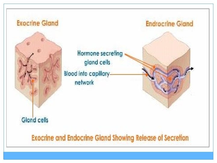 TYPES OF GLANDS (BASED ON THE MODE OF POURING THEIR SECRETIONS) EXOCRINE GLANDS: Products are released through ducts or tubes. v Secretes mucus, saliva, earwax, digestive enzymes. v ENDOCRINE GLANDS: Products are released directly into the fluid bathing the gland. v Hormones v
