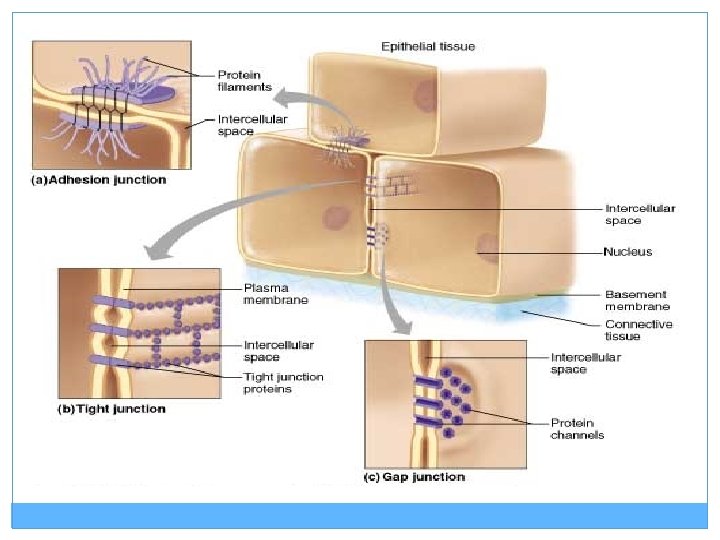 TYPES OF CELL JUNCTIONS (STRUCTURAL AND FUNCTIONAL LINKS BETWEEN EPITHELIAL CELLS) TIGHT JUNCTION: Plasma membranes of adjacent cells are fused at intervals. Help to stop substances from leaking across a tissue. ADHERING JUNCTION: Perform cementing function to keep neighbouring cells together. GAP JUNCTION: Facilitates the cells to communicate with each other by connecting the cytoplasm of adjacent cells for rapid transfer of ions and molecules.