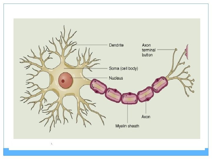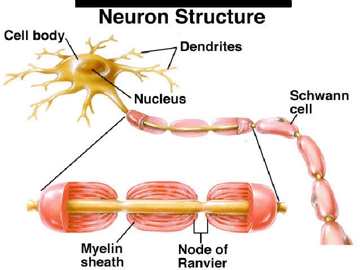 STRUCTURE OF NEURON: Dendrite : Function: receive incoming stimuli. Cell Body or Soma : Function: Directs impulses from the dendrites to the axon. Nucleus : Control center of the Soma. Axon: Pathway for the nerve impulse (electrical message) from the soma to the opposite end of the neuron. Myelin Sheath : An insulating layer around an axon. Made up of Schwann cells. Nodes of Ranvier : Gaps between schwann cells.