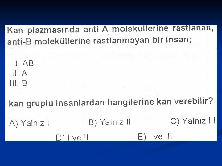 1. Kanında sadece B antijeni bulunan bir kişinin kan grubu nedir? n B 2. Kanında sadece B antikoru bulunan bir kişinin kan grubu nedir? A 3. AB rh – kan grubuna sahip olan kişinin antijen ve antikorlarını belirtiniz. n