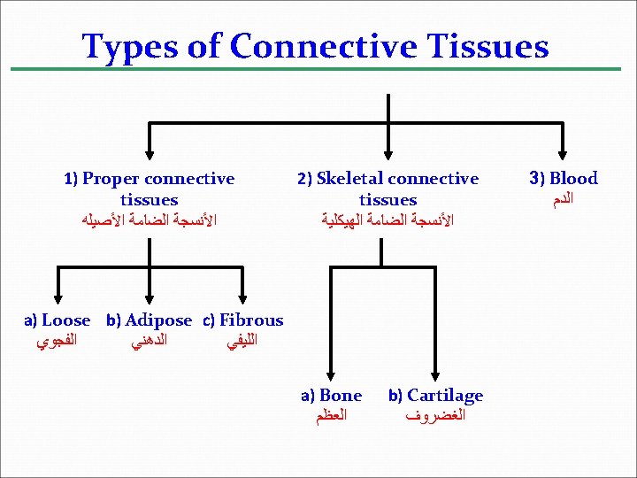 Second: Connective tissues Characterized by 1. Cells widely separated from each other in a matrix that is produced by the cells (cells are scattered ). 2. The matrix generally consists of fibers 3. The matrix may be solid (as in bone), gelatinous, or liquid (as in blood). 4. The functions of connective tissues are to bind and support other tissues.