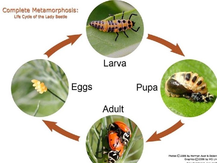 INSECTS METAPHORSIS • Insects go through several stages of growth and development • Many change in appearance • Different stages include – Eggs – Larva: stage that the insect emerges from the egg – Pupa: stage in an insects life when it is wrapped in a cocoon. – Adult