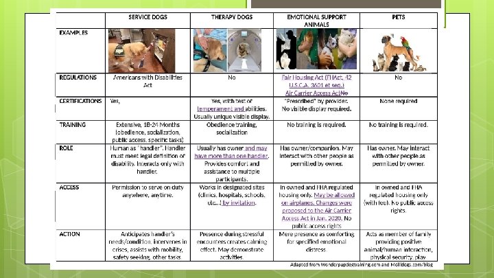 Service Animal “Service animals are defined as dogs that are individually trained to do work or perform tasks for people with disabilities … The work or task a dog has been trained to provide must be directly related to the person’s disability. Dogs whose sole function is to provide comfort or emotional support do not qualify as service animals under the ADA. ” Revised ADA requirements. U. S. Department of Justice, Civil Rights Division. Disability Rights Section https: //www. ada. gov/service_animals_2010. htm