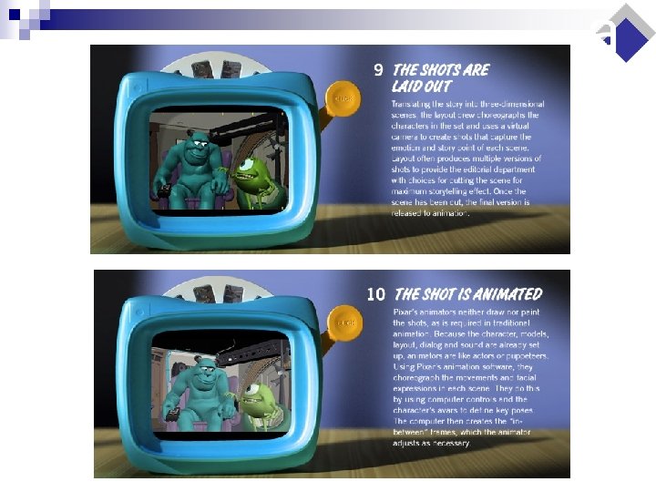 Definisi umum animasi n Suatu proses dimana tiap frame pembangun film diproduksi ¨ dibangkitkan dalam kerangka grafika komputer ¨ ‘memotret’ gambar yang dilukis tangan ¨ ‘memotret’ model yang diubah sedikit demi sedikit (stop motion, exp: Bob the Builder) n Saat frame-frame tersebut ditampilkan secara berurutan dengan cepat (16 frame per detik atau lebih), akan tercipta ilusi pergerakan kontinyu (teori persistence of vision)