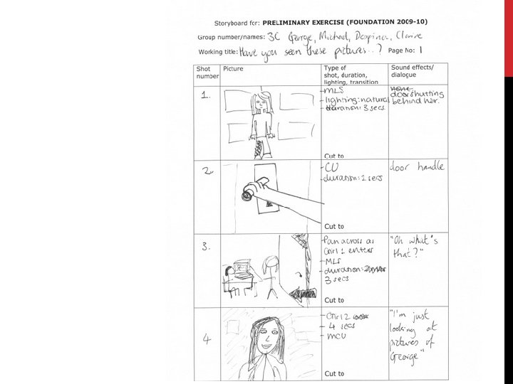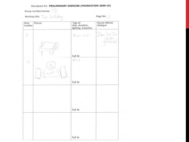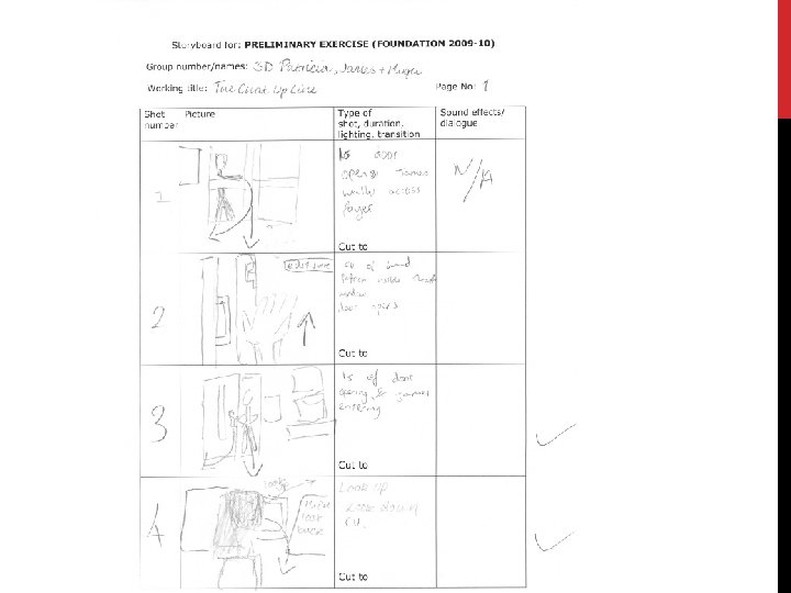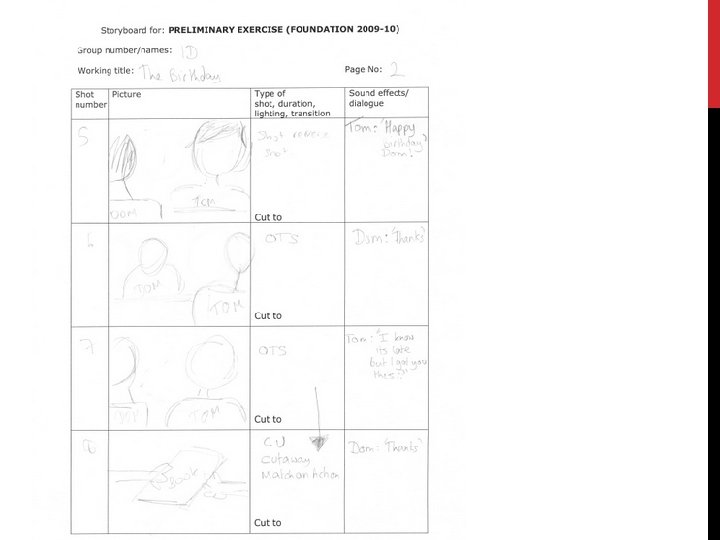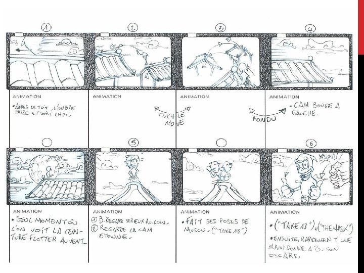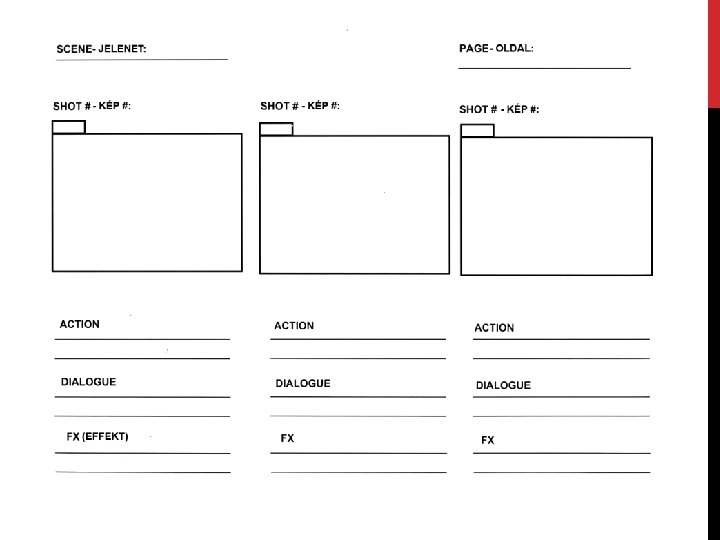 STORYBOARD Képes forgatókönyv • Vázlatosak (pálcikaemberek) vagy • Teljesen kidolgozottak Karaktervázlatok Helyszínrajzok Minden cselekményre vonatkozóan • action: részletes cselekmény • dialogue: párbeszéd, narráció • sound: zenei és hanghatások leírása