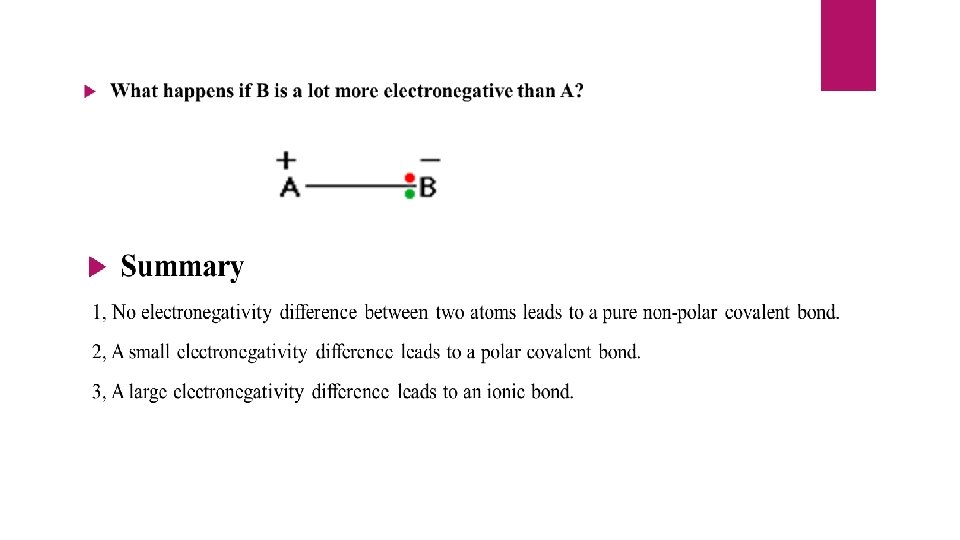 What happens if two atoms of equal electronegativity bond together? Consider a bond between two atoms, A and B. Each atom may be forming other bonds as well as the one shown - but these are irrelevant to the argument. What happens if B is slightly more electronegative than A?