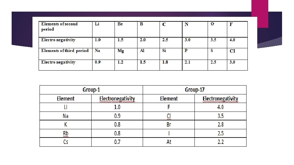 The main factors on which the electronegativity depends are effective nuclear charge and atomic radius. + Greater the effective nuclear charge greater is the electro negativity + Smaller the atomic radius greater is the electro negativity + The electro negativity of any given element is not constant but varies depending on the element to which it is bound. In a period electronegativity increases in moving from left to right. This is due to the reason that nuclear charge increases whereas atomic radius decreases as we move from left to right in a period. Halogens have the highest value of electronegativity in their respective periods. In a group electronegativity decreases on moving down the group. This is due to the effect of increased atomic radius.