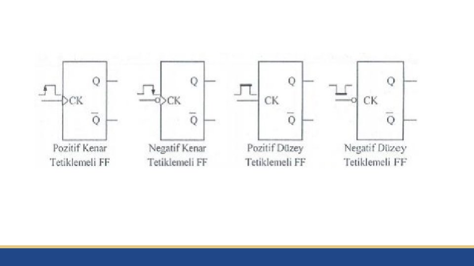 Flip-Flop Çeşitleri Flip-floplar başlıca 4 çeşittir. • • RS flip-flop JK flip-flop D flip-flop T flip-flop Preset/Clear girişli flip-floplar vardır. Her bir flip-flop çeşidinin Preset/Clear girişli olanı vardır.