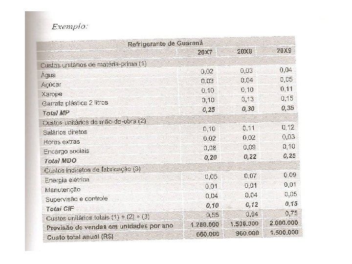 • 1 – Devemos analisar o projeto de uma fábrica de cerveja. Calcule primeiramente as receitas e custos totais dos próximos cinco anos, sabendo que: Fábrica de cerveja Ano 1 2 3 4 5 Latas de cerveja 700. 000 800. 000 900. 000 Preço por lata ($) 1, 00 1, 20 MP ($) 0, 20 0, 20 MDO ($) 0, 10 0, 15 CIF ($) 0, 20 0, 25 Custos unitários totais • 2 – Continuando o exercício 2, as despesas administrativas são fixas em R$ 100 mil por ano. O investimento em capital físico é de R$ 500 mil, o investimento em capital de giro é de R$ 300 mil, e a depreciação é de 20% ao ano. O valor residual do capital físico é de R$ 100 mil no final do quinto ano. A empresa pagará IR sobre lucro real de 30%. TMA é de 15% ao ano. Devemos aceitar o projeto do VPL?