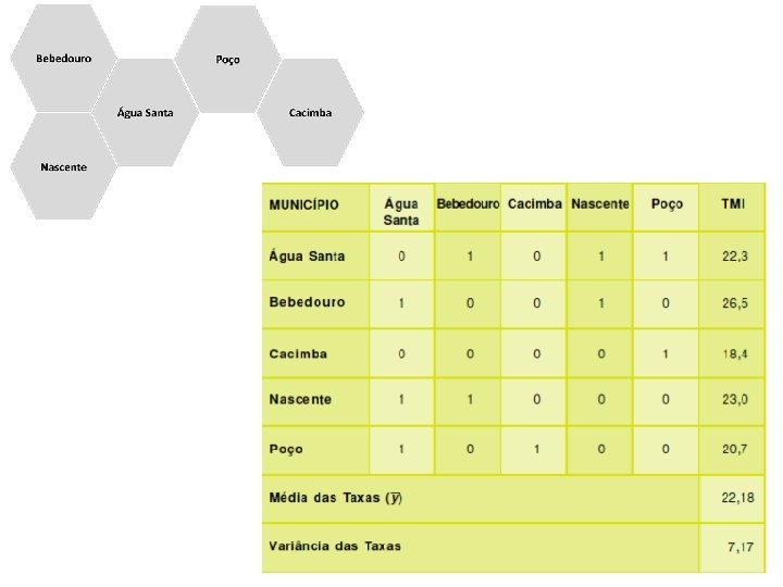 Município i Água Santa Bebedouro Cacimba Nascente Poço Município j Bebedouro Cacimba Nascente Poço Água Santa Cacimba Nascente Poço Agua Santa Bebedouro Nascente Poço Água Santa Bebedouro Cacimba Nascente Vizinhança Taxa em i Taxa em j (Wij) (yi) (yj) 1 22, 3 26, 5 0 1 22, 3 23, 0 1 22, 3 20, 7 Subtotal para i = 1 (Água Santa) 1 0 Subtotal para i = 2 (Bebedouro) 0 0 0 1 Subtotal para i = 3 (Cacimba) 1 1 0 0 Subtotal para i = 4 (Nascente) 1 0 Subtotal para i = 5 (Poço) 0, 518 0 0, 098 -0, 178 0, 616 0, 518 0 3, 542 0 4, 06 0 0 0 5, 594 0, 098 3, 542 0 0 3, 64 -0, 178 0 5, 594 0 5, 416 19, 152