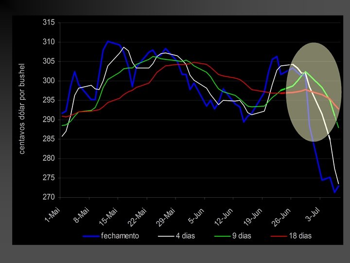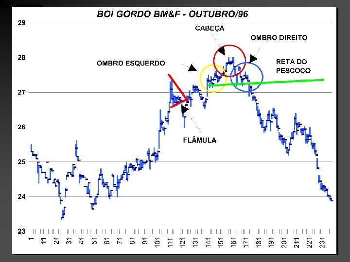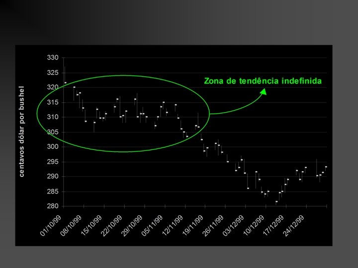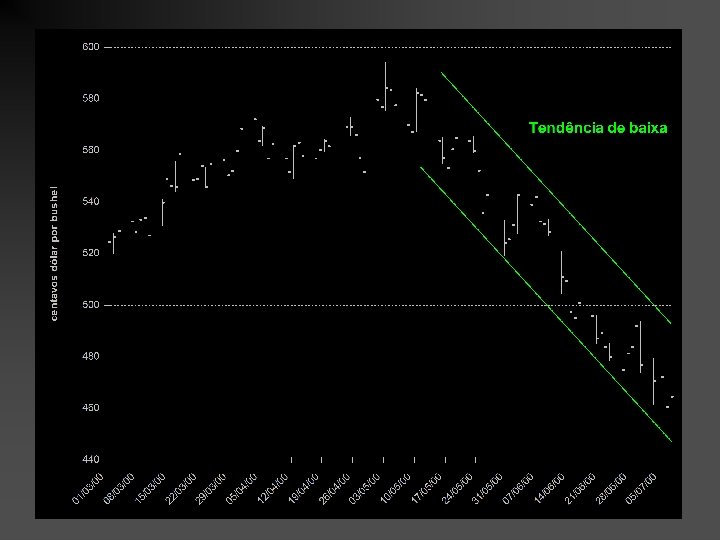 SUPORTE E RESISTÊNCIA O preço deve variar entre as linhas de suporte e resistência - abaixo desse nível o preço não devem cair comprar o que faz com que o preço suba - acima desse nível o preço não deve subir e o preço cai decide-se vender Quebra de tendência • Se os preços ultrapassarem o suporte devido a um fator novo, há o rompimento da reta de suporte e sinalização para a venda • Se os preços ultrapassarem a resistência devido a um fator novo, há o rompimento da reta de resistência e sinalização para a compra