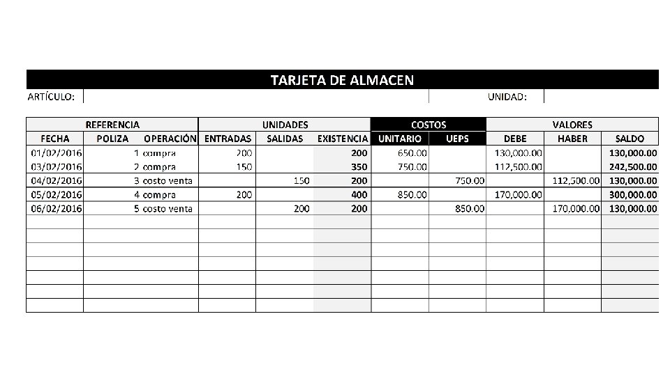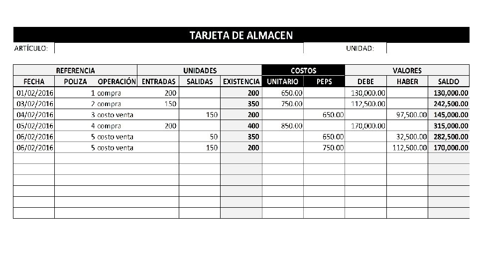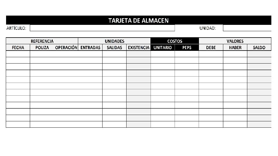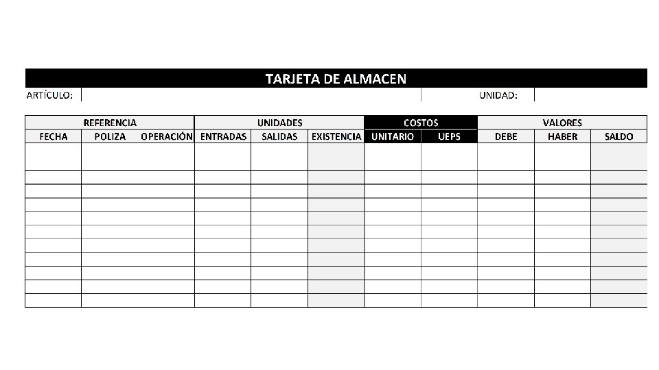 TARJETA DE ALMACEN ARTÍCULO: FECHA UNIDAD: REFERENCIA UNIDADES COSTOS POLIZA OPERACIÓN ENTRADAS SALIDAS EXISTENCIA UNITARIO PROMEDIO DEBE VALORES HABER SALDO