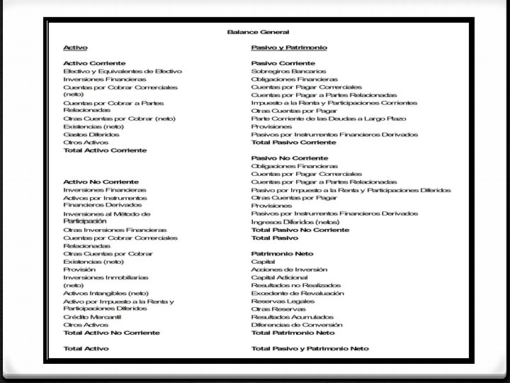 a) Estructura del Balance General Activos = Bienes y derechos de la empresa Usos Participaciones Pasivos + Patrimonio De terceros Dueños / accionistas Fuentes i g i b i l i d a d L i q u i d e z E x