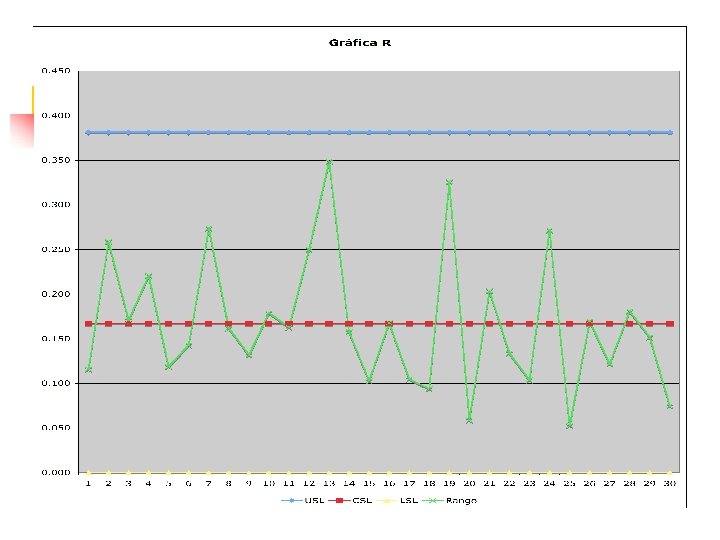 Procedimiento rápido utilizando el rango n n n Tome 20 sub grupos, cada uno de tamaño 4 y un total de 80 mediciones Calcule el campo de valores, R, de cada sub grupo Calcule el campo promedio, Calcule el valor de la desviación estándar de la población La capacidad del proceso será igual a 6σ