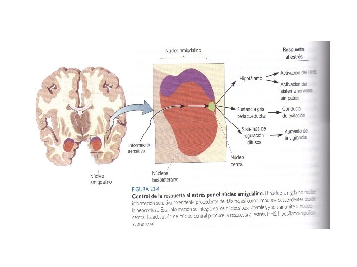 • Regulación del eje HHS por el núcleo amigdalino y el hipocampo • Núcleo amigdalino es escencial para el miedo, la información sensorial entra en la porción basolateral y se dirige al núcleo central. • Cuando el núcleo central se activa, se da respuesta al estrés