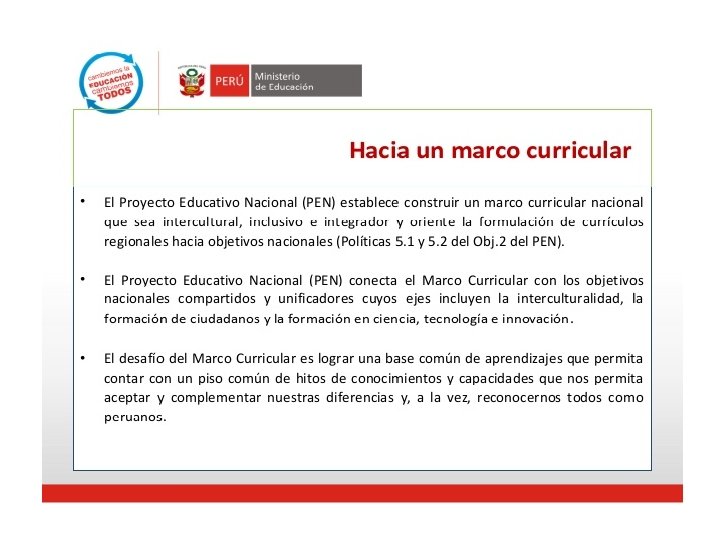 Prioridades de la Política Educativa Nacional 2012 -2016 RM N° 0369 -2012 -ED / 26 set. 1. Aprendizajes de calidad para todos con énfasis en comprensión lectora, matemática, ciencia y ciudadanía. 2. Reducción de brechas en el acceso a servicios educativos de calidad para los niños y niñas menores de 6 años. 3. Mejora significativa de logros de aprendizaje para niños, niñas y adolescentes en zonas rurales. 4. Reducción de brechas en el acceso a servicios educativos de calidad: estudiantes que tienen como lengua materna el quechua, el aimara, o alguna lengua amazónica, aprenden en su propia lengua y en castellano. 5. Formación y desempeño docente en el marco de una carrera pública renovada. 6. Fortalecimiento de instituciones educativas en el marco de una gestión descentralizada, participativa, transparente y orientada a resultados. 7. Reducción de brechas en el acceso a la educación superior para jóvenes de menores ingresos. 8. Desarrollo de competencias laborales, profesionales y de creación de conocimiento en articulación con la demanda productiva y las necesidades de desarrollo del país. 9. Promoción de la actividad física regular, la recreación y el deporte a nivel escolar, juvenil y adulto. 10. Promoción del deporte competitivo.