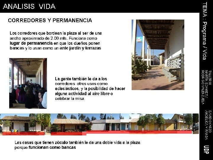 ANALISIS PAREDONES TEMA : Detalles/Particularidades • Bancas comunes en los corredores de la zona, ayuda a la formación de espacios FDA. VARGAS TALLER III M°JOSE IBAÑEZ MARTIN SCHMIDT / RODRIGO VALENZUELA • Altura (20 cm aprox. ) permite darle mayor dignidad y su vez aislarla.