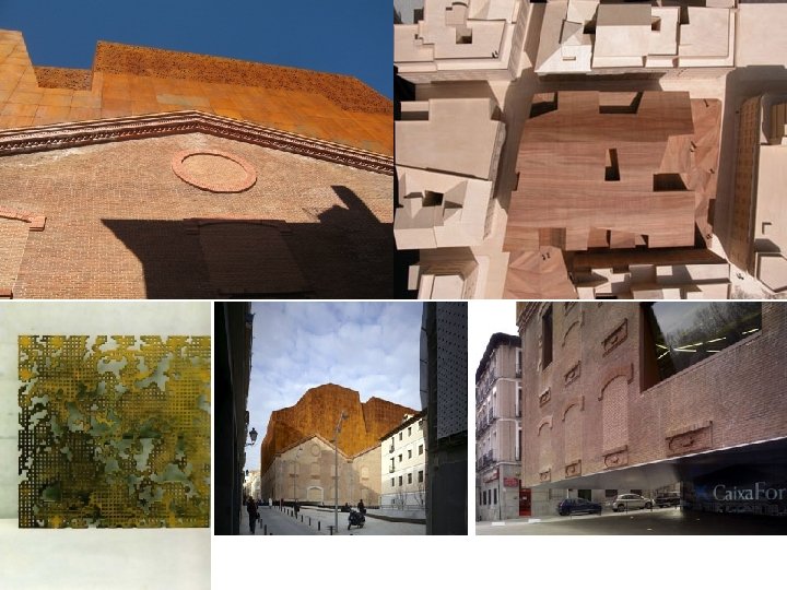 Caixa. Foum CAIXAFORUM La antigua mole mantuvo sus fachadas, pero a fin de ganar espacio fueron perforadas o abiertas en su planta baja prescindiendo de pilares. Así, el edificio de ladrillo parece flotar gracias a una sustentación central que pasa casi desapercibida. El nuevo museo se corona con varias plantas añadidas que muestran al exterior un acabado oxidado. DIEGO LAVIN TALLER III JONATHAN CABREA MARTIN SCHMIDT / RODRIGO VALENZUELA El acceso al museo desde el paseo del prado se efectúa por una pequeña plaza ganada con la demolición de una vieja gasolinera. La fachada lateral de un bloque anexo quedaba al descubierto, y fue embellecida mediante un espectacular tapiz vegetal, conformado por cientos de plantas que se mantienen vivas mediante un sistema de riego oculto.