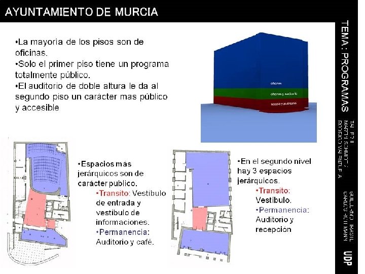Rojo: concentra una menor cantidad de flujo peatonal: corredores presentan pendiente y no son lineales. Se utiliza más como un destino específico. Azul: Concentra mayor número de peatones: corredores son lineales y conectados con el eje principal. A demás de este lado se encuentra la catedral que es un punto de encuentro comunitario. (A veces se realizan misas).