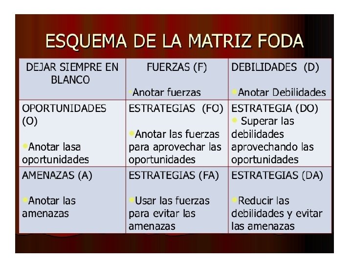 Matriz FODA. Es una herramienta que ayuda a crear 4 tipos de estrategias: • Estrategias de fortalezas y oportunidades FO. Utiliza las fortalezas para aprovechar las oportunidades. • Estrategia de debilidades y oportunidades DO. Mejoran las debilidades al aprovechar las oportunidades. • Estrategia de fortalezas y amenazas FA. Usan las fortalezas para evitar o reducir el impacto de las amenazas externas. • Estrategia de debilidades y amenazas DA. Son tácticas defensivas que tienen como propósito reducir las debilidades y evitar las amenazas.
