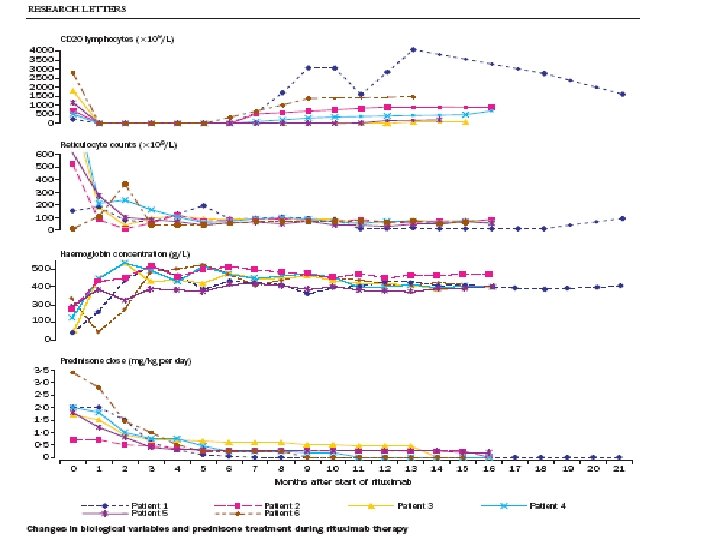 Rituximab et AHAI « chaudes » : Quartier et al. (Lancet 2001; 358: 1511 -13) Sexe/age Durée Coombs Manif. Tt antérieur. Quartier et al. (Lancet 2001; 358: 1511 -13) AHAI associées Tt en cours 1) F/7 3 ans Ig. G HM Spl. , prdn, MP, IVIg, Cyc. Transf. x 3/s, prdn 2 mg/kg/j, Cyc. 2) M/13 10 ans Ig. G PTI AAN + Spl. , prdn, IVIg, MP, Cyc, EP Transf x 1/s, prdn 0. 7 mg/kg/j, MP 3) M/9 2. 5 ans Ig. G Anti-XI Prdn, IVIg, Csa, Aza Transf x 1/s, prdn 1. 7 mg/kg/j, Csa, Aza. 4) F/35 4 ans Ig. G + Ct BMT Prdn, Csa, IVIg Transf x 2/s, prdn 2 mg/kg/j, Csa 5) M/24 6 ans Ig. G Hépatite C géantes Prdn, IVIg, Csa, Aza Transf x 5/s, prdn 1. 8 mg/kg/j, Csa, Aza 6) F/13 4 ans Ig. G + Ct Anti-DNA + Prdn, IVIg, MP Ac. L + Transf x 1/s, prdn 3. 5 mg/kg/j