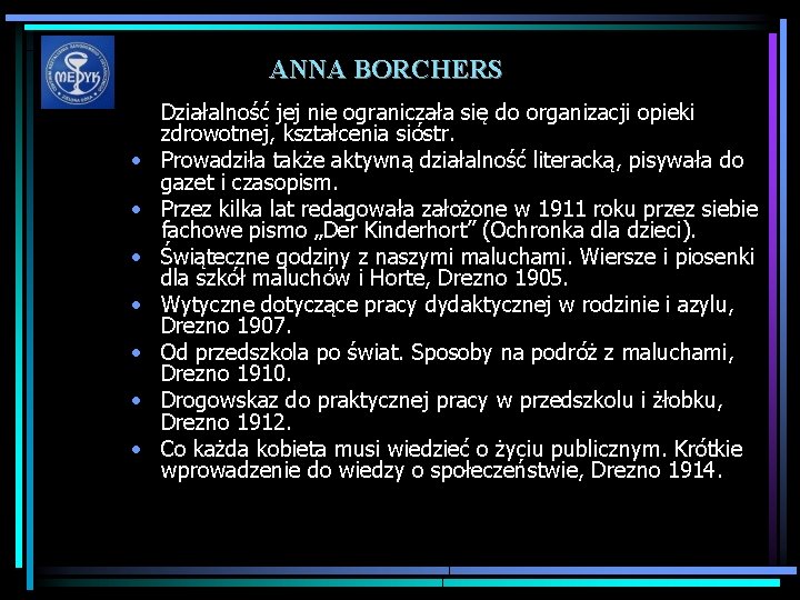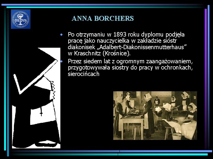ANNA BORCHERS • Po otrzymaniu w 1893 roku dyplomu podjęła pracę jako nauczycielka w zakładzie sióstr diakonisek „Adalbert-Diakonissenmutterhaus” w Kraschnitz (Krośnice). • Przez siedem lat z ogromnym zaangażowaniem, przygotowywała siostry do pracy w ochronkach, sierocińcach