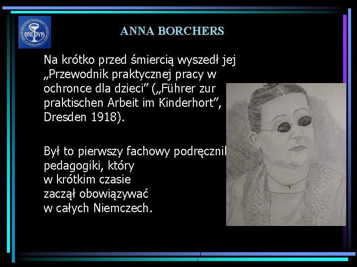 ANNA BORCHERS Na krótko przed śmiercią wyszedł jej „Przewodnik praktycznej pracy w ochronce dla dzieci” („Führer zur praktischen Arbeit im Kinderhort”, Dresden 1918). Był to pierwszy fachowy podręcznik pedagogiki, który w krótkim czasie zaczął obowiązywać w całych Niemczech.