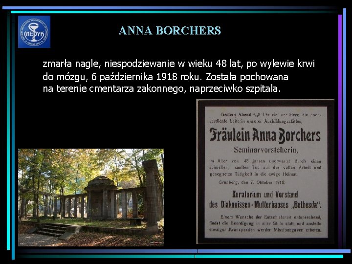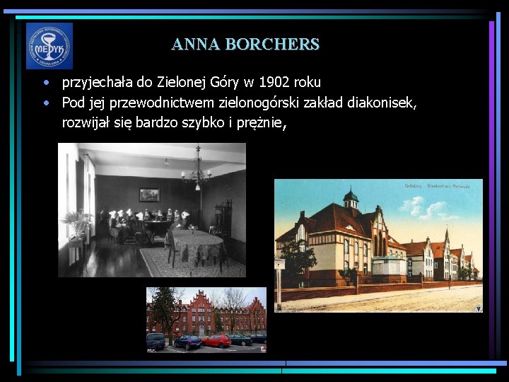 ANNA BORCHERS • przyjechała do Zielonej Góry w 1902 roku • Pod jej przewodnictwem zielonogórski zakład diakonisek, rozwijał się bardzo szybko i prężnie,