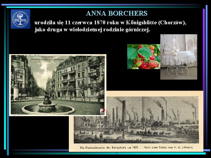 ANNA BORCHERS urodziła się 11 czerwca 1870 roku w Königshütte (Chorzów), jako druga w wielodzietnej rodzinie górniczej.