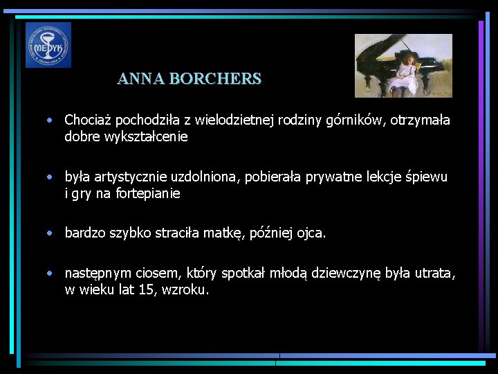 ANNA BORCHERS • Chociaż pochodziła z wielodzietnej rodziny górników, otrzymała dobre wykształcenie • była artystycznie uzdolniona, pobierała prywatne lekcje śpiewu i gry na fortepianie • bardzo szybko straciła matkę, później ojca. • następnym ciosem, który spotkał młodą dziewczynę była utrata, w wieku lat 15, wzroku.