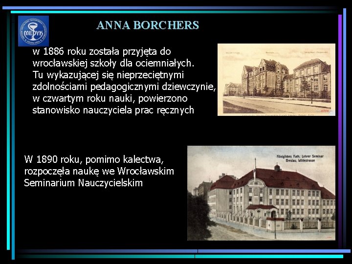 ANNA BORCHERS w 1886 roku została przyjęta do wrocławskiej szkoły dla ociemniałych. Tu wykazującej się nieprzeciętnymi zdolnościami pedagogicznymi dziewczynie, w czwartym roku nauki, powierzono stanowisko nauczyciela prac ręcznych W 1890 roku, pomimo kalectwa, rozpoczęła naukę we Wrocławskim Seminarium Nauczycielskim