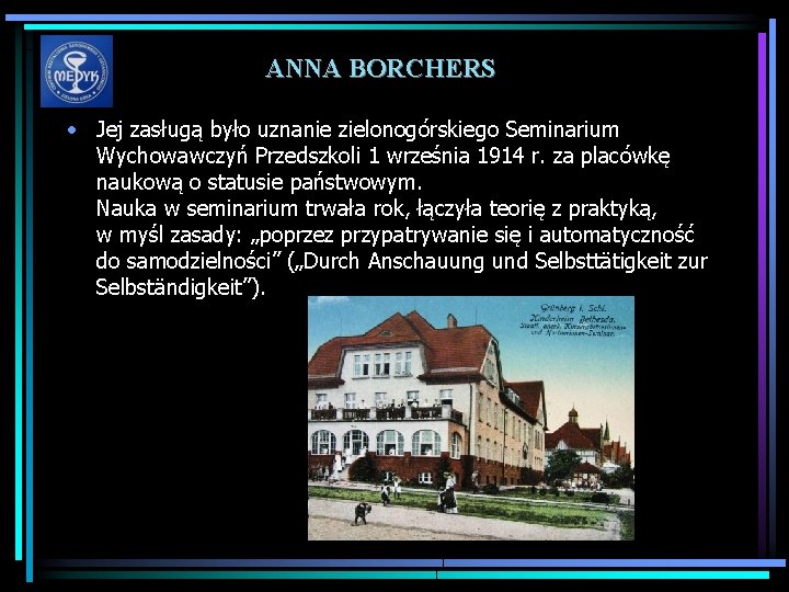 ANNA BORCHERS • Jej zasługą było uznanie zielonogórskiego Seminarium Wychowawczyń Przedszkoli 1 września 1914 r. za placówkę naukową o statusie państwowym. Nauka w seminarium trwała rok, łączyła teorię z praktyką, w myśl zasady: „poprzez przypatrywanie się i automatyczność do samodzielności” („Durch Anschauung und Selbsttätigkeit zur Selbständigkeit”).