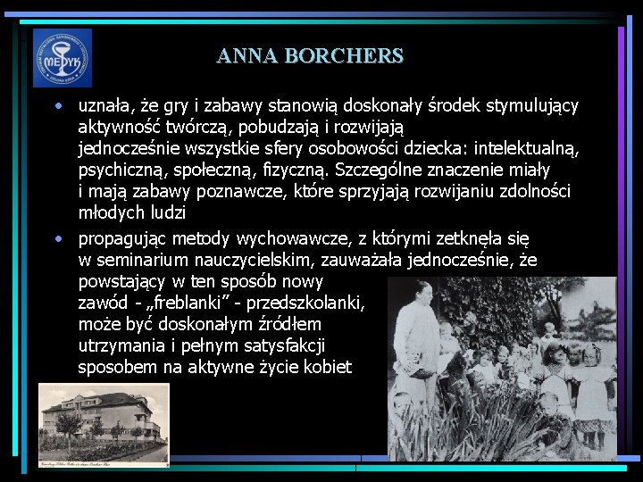 ANNA BORCHERS • uznała, że gry i zabawy stanowią doskonały środek stymulujący aktywność twórczą, pobudzają i rozwijają jednocześnie wszystkie sfery osobowości dziecka: intelektualną, psychiczną, społeczną, fizyczną. Szczególne znaczenie miały i mają zabawy poznawcze, które sprzyjają rozwijaniu zdolności młodych ludzi • propagując metody wychowawcze, z którymi zetknęła się w seminarium nauczycielskim, zauważała jednocześnie, że powstający w ten sposób nowy zawód - „freblanki” - przedszkolanki, może być doskonałym źródłem utrzymania i pełnym satysfakcji sposobem na aktywne życie kobiet