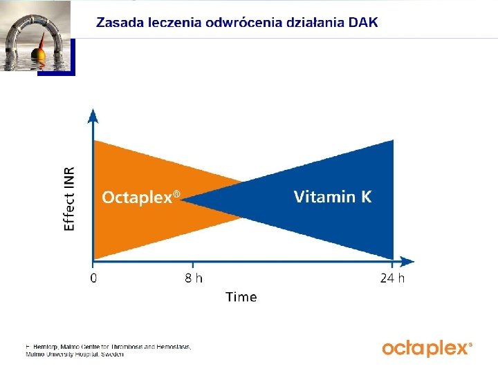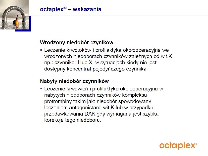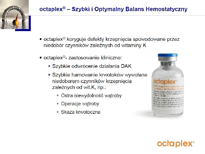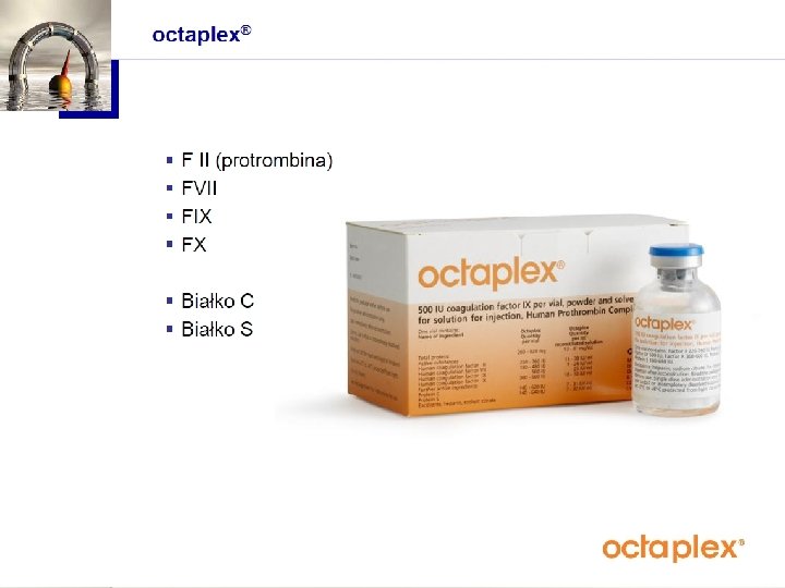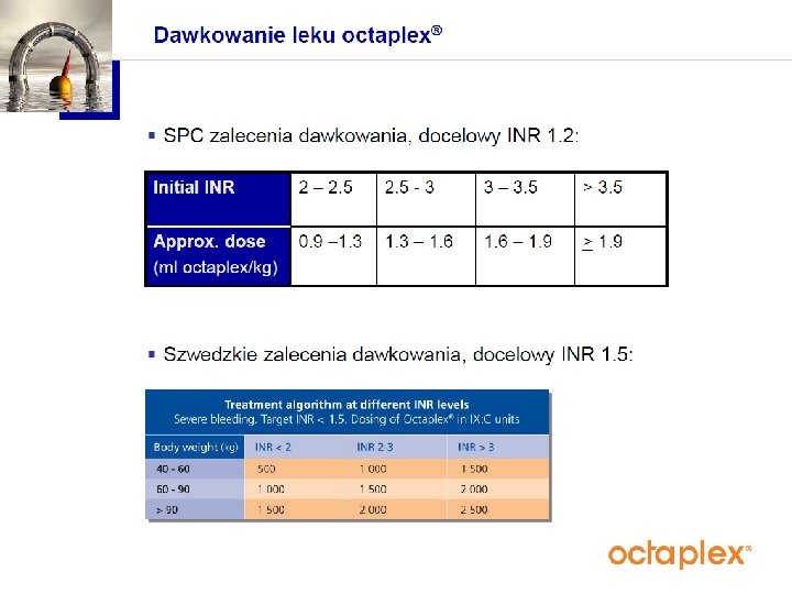 Terapia preparatem Octaplex Ze względu na nieoznaczalne wartości krzepnięcia oraz zagrożenie wystąpienia niewydolności wielonarządowej podjęto decyzję o przyjęciu chorej do OIT. Chorej podano Octaplex: ustalona dawka 1, 9 ml/ kg m. c. (6 x 500 j. m. ). Po podaniu 1/3 dawki pobrano krew do w celu oznaczenia INR. Wobec unormowania się parametrów krzepnięcia w granicach zakresu terapeutycznego, podjęto decyzję o podaniu ½ wyliczonej pierwotnie dawki Octaplexu.