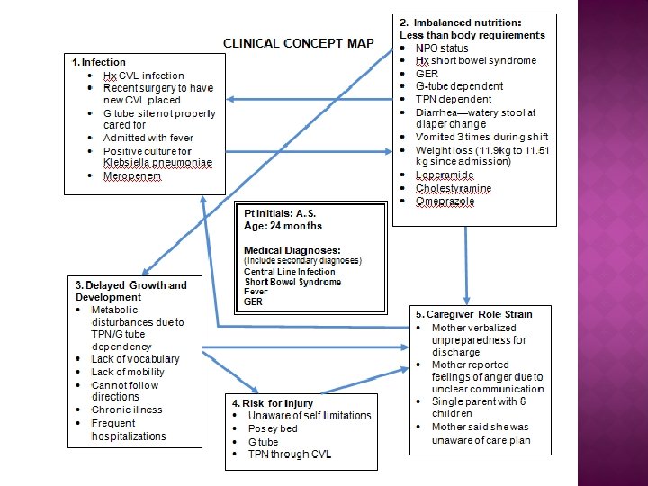 2. Imbalanced nutrition: less than body requirements Related to: • NPO • Hx short bowel syndrome • GER • G-tube dependent • TPN dependent Medications: • Loperamide • Cholestyramine • Omeprazole Evidenced by: • Weight loss (11. 9 kg to 11. 51 kg) • Vomited 3 times during shift • Diarrhea—watery stool